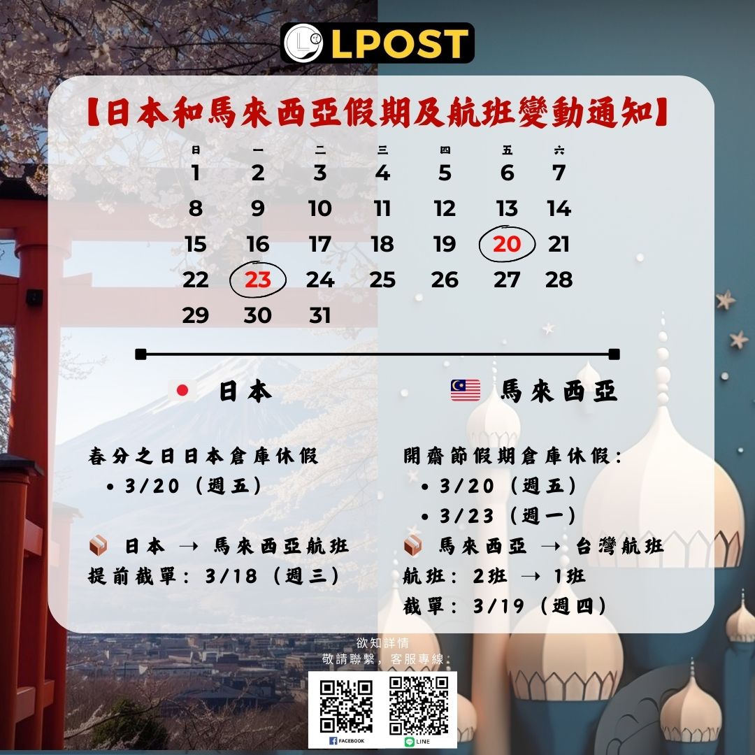 因日本及馬來西亞假期影響,航班與倉庫作業將有所調整,請大家提前安排寄送時間,以免影響出貨。